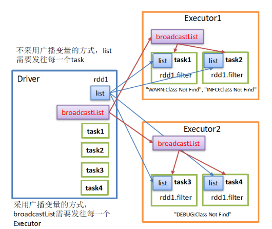 代码的图形理解,相较于使用List方式,广播变量无需向每个task中都分发变量的值。