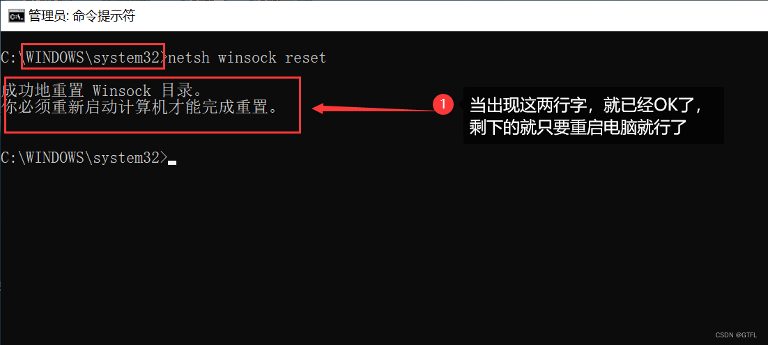 当看到这个页面时,就可以输入“netsh winsock reset”命令,再按下回车键,当出现下面两行字时,就说明已经OK了。