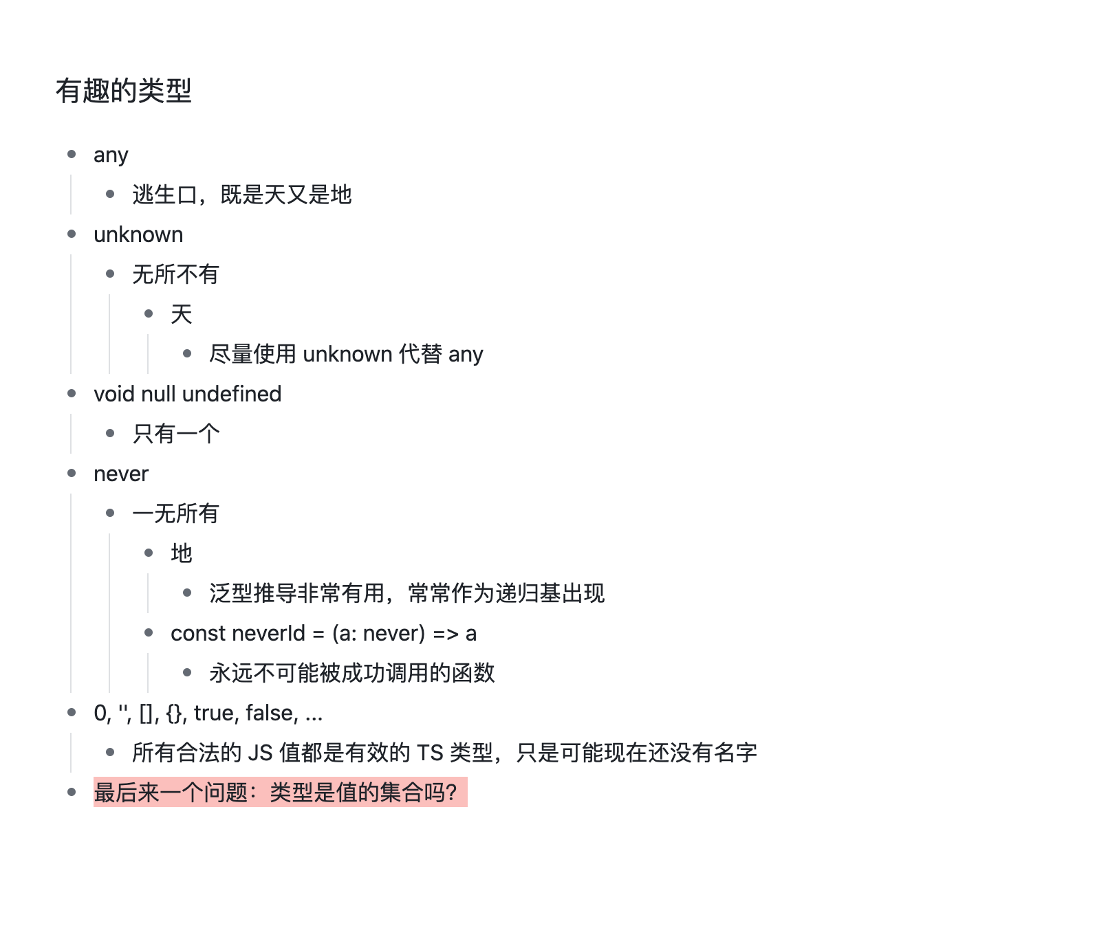 这是一个非常有趣的问题,正确答案是:编程语言中的类型,除了一个特例之外,确实都是值的集合。但因为特例的存在,我们就不能将编程语言中的类型视为值的集合。这个特例在 TS 中叫 never,并无对应的值,用于表示代码会崩溃退出或陷入死循环。并且,never 是所有类型的子类型,这意味着你写的任何看似被静态类型保护着的安全无忧的函数,实际运行时也都有可能崩溃或死循环。很无奈,这种没人喜欢的可能性是静态类型系统允许的合法行为。所以,静态类型也不是万能的。