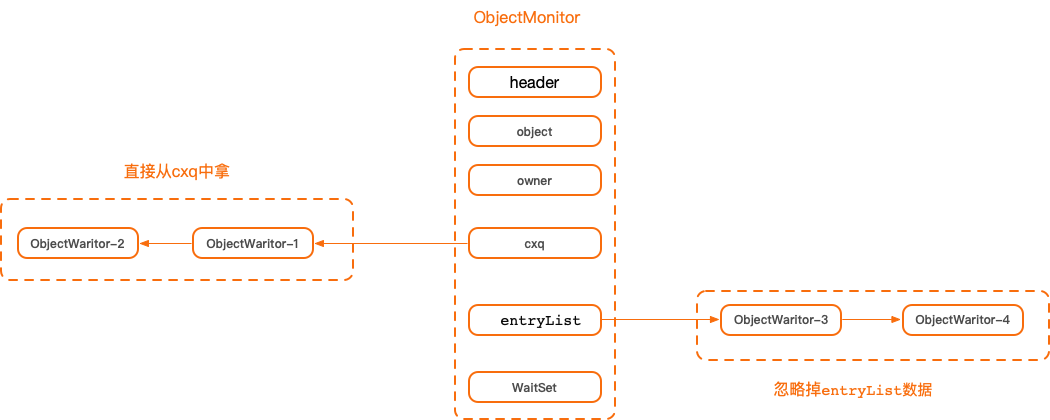 QMode=1 的时候 这个是默认策略 优先从_EntryList 中获取 如果_EntryList为空的情况,把_cxq进行队列反转然后从_cxq获取