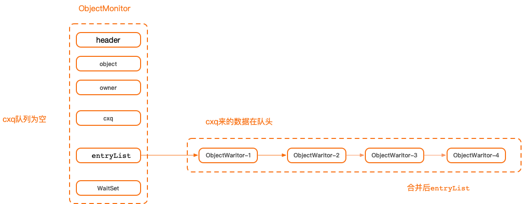 是队列用来获取锁的缓冲区,用来将cxq和waitSet中的数据 移动到entryList进行排队。这个统一获取锁的入口。一般是cxq 或者waitSet数据复制过来进行统一排队。