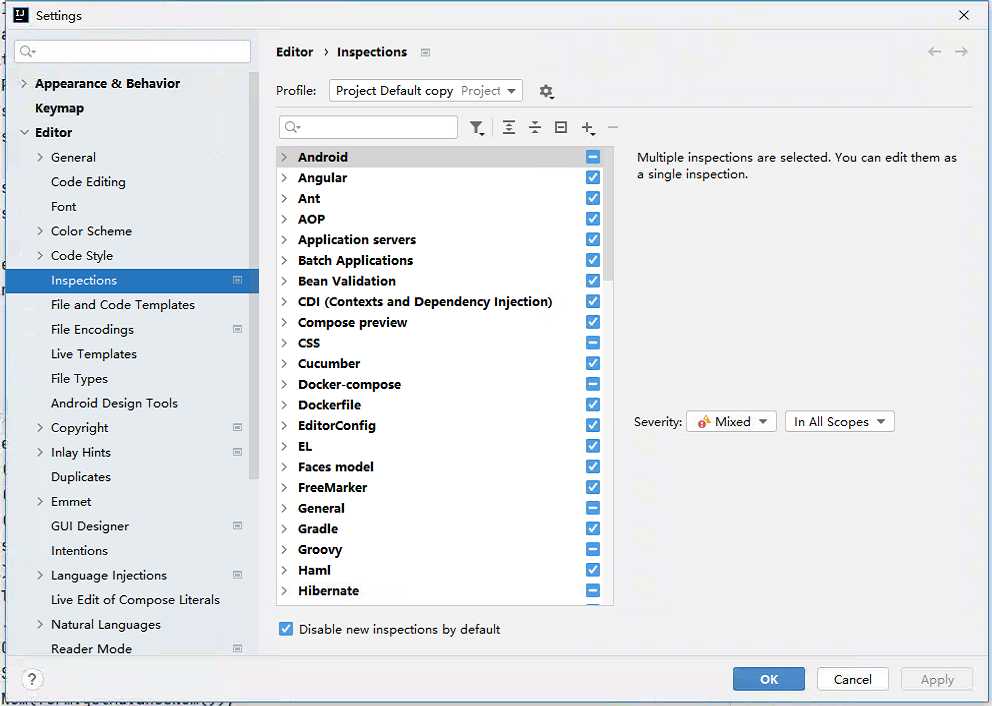 进入到Inspections项后,我们可以看到右侧有很多检查项,我们只需要保留我们常用需要的语言的检查项就可以了,其他的去掉,这样就会减少很多资源消耗