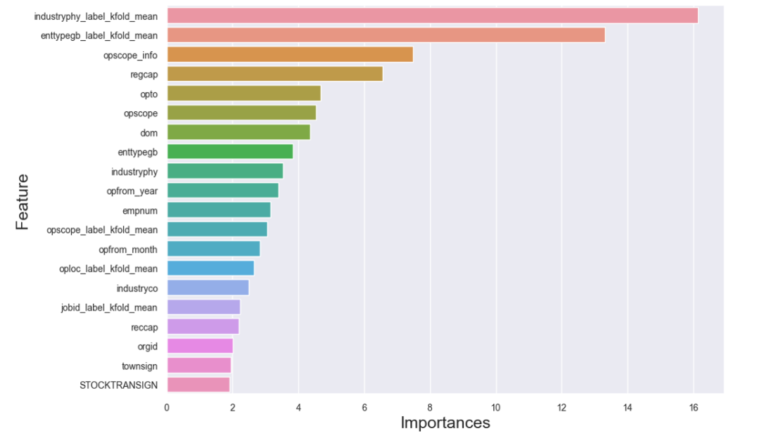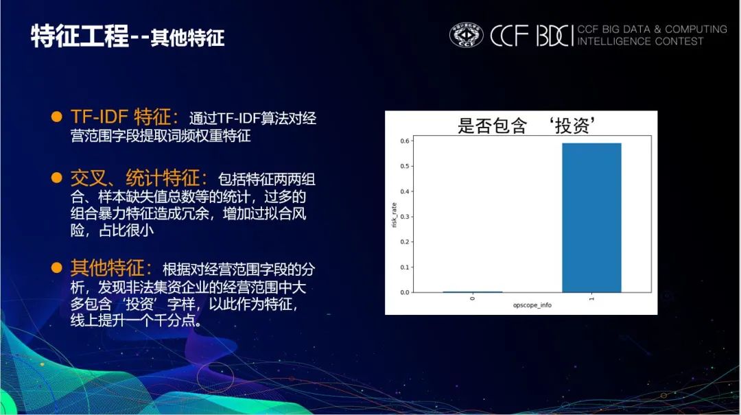 其他特征主要包括一些交叉组合特征,以及特殊字段的特征提取,例如经营范围opscope列,为文本类型字段,通过TF-IDF计算文本中的词频权重,并进行均值等统计特征的提取,取得了一定的提升。