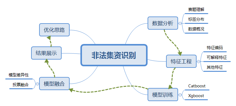本教程包括以下内容:数据探索、特征提取、特征筛选、模型融合,通过分析企业各类信息统计表,紧紧围绕非法集资不同的风险类型,提取出可解释特征。差异性是融合提升的关键,通过特征差异(不同表的特征结合)、模型差异(catboost模型与xgboost模型)、参数差异三个角度构造差异性的模型,进行加权投票融合,提升模型的稳定性与泛化能力。