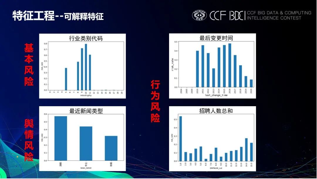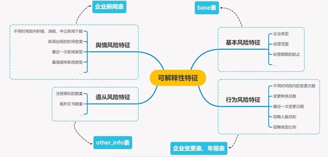 可解释特征的提取是本次比赛的关键,本赛题中仅仅围绕非法集资的四种风险类型构造出一系列可解释性特征,与业务紧密结合,应用价值较高。具体特征如下图: