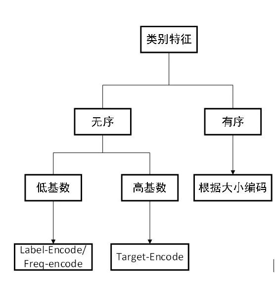 对于不同类别特征,我所用到的编码方式主要有三种,Label-Encode、Target-encode、Freq-encode,主要的思路为如下图: