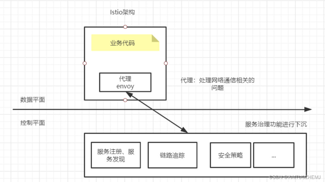 - Envoy: 在istio框架中使用Envoy作为代理,使用的是C++开发的软件,用于为服务网格中的所有服务提供所有的入站和出站流量,唯一一个与数据平面打交道的