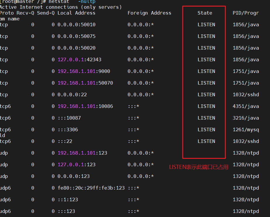 该命令是查看当前所有已经使用的端口情况: