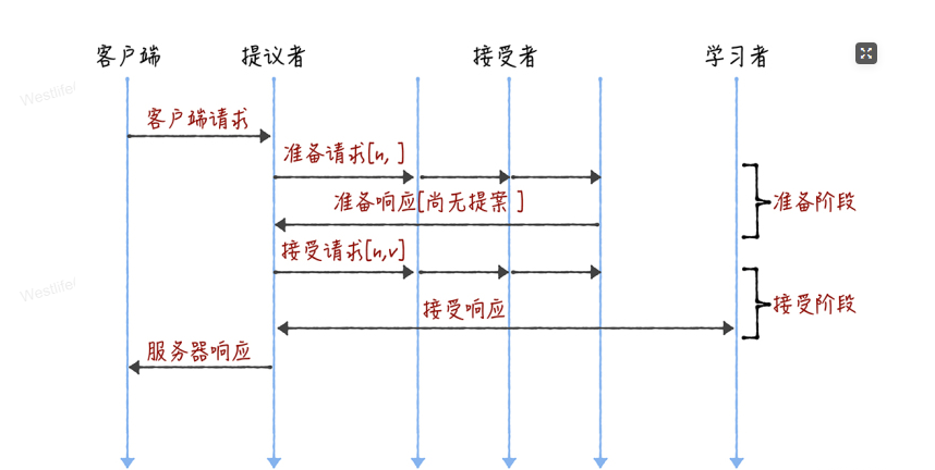 Basic Paxos 是通过二阶段提交来达成共识的。在第一阶段,也就是准备阶段,接收到大多数准备响应的提议者,才能发起接受请求进入第二阶段(也就是接受阶段):