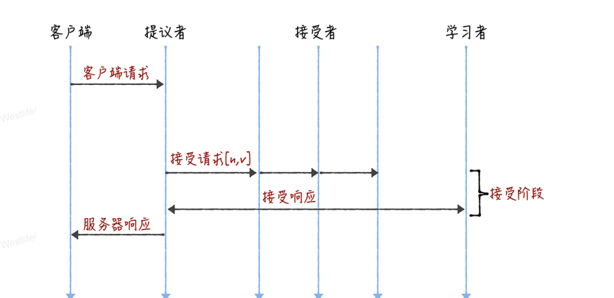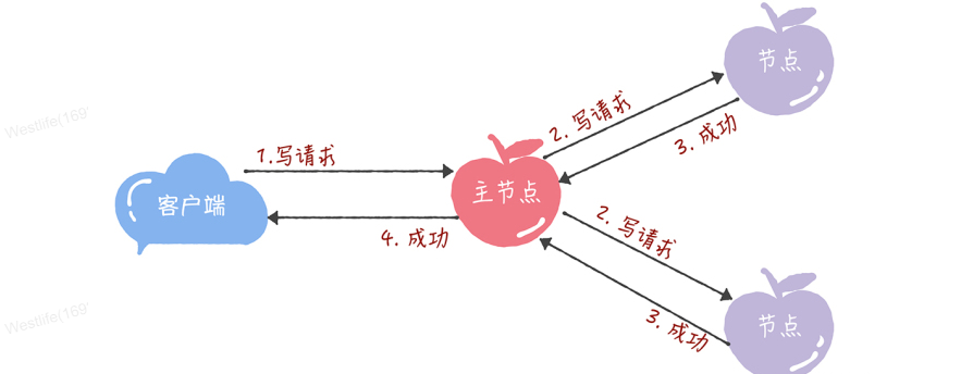 - 所有的读请求和写请求都由主节点来处理。当主节点从客户端接收到写请求后,作为提议者,执行 Basic Paxos 实例,将数据发送给所有的节点,并且在大多数的服务器接受了这个写请求之后,再响应给客户端成功: