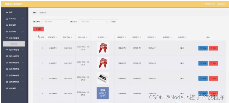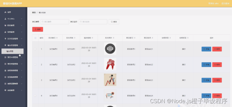 发文信息管理,管理员可在发文信息管理页面查看发文编号、发文名称、发文时间、发文图片、领导账号、职员账号、职员姓名、审核回复、审核状态等内容,还可进行删除等操作,如图5-17所示。
