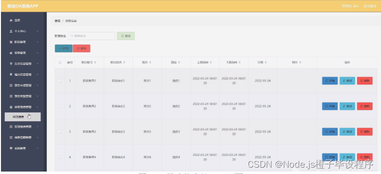 排班信息管理,管理员可在排班信息管理页面查看职员账号、职员姓名、班次、岗位、上班时间、下班时间、日期、图片等内容,还可进行新增、修改或删除等操作,如图5-20所示。