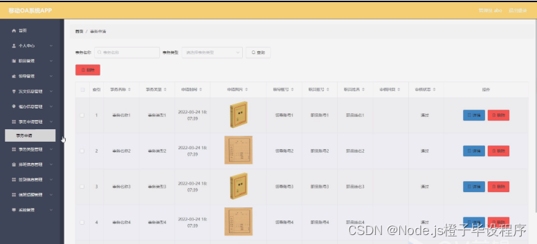 事务申请管理,管理员可在事务申请管理页面查看事务名称、事务类型、申请时间、申请图片、领导账号、职员账号、职员姓名、审核回复、审核状态等内容,还可进行删除等操作,如图5-19所示。