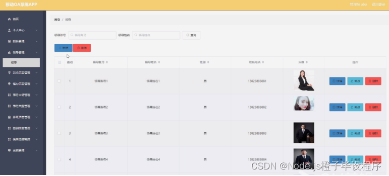 领导管理,管理员可在领导管理页面查看领导账号、领导姓名、性别、联系电话、头像等内容,还可进行新增、修改或删除等操作,如图5-16所示。