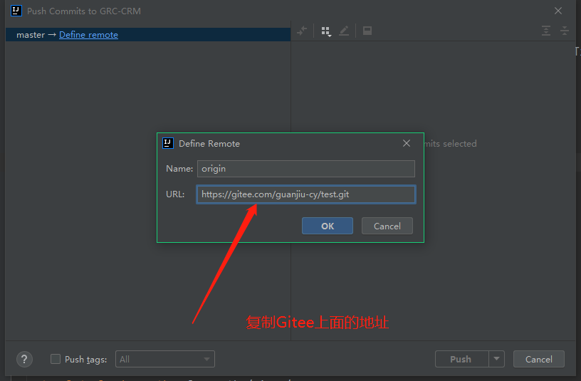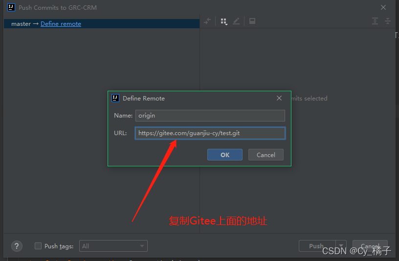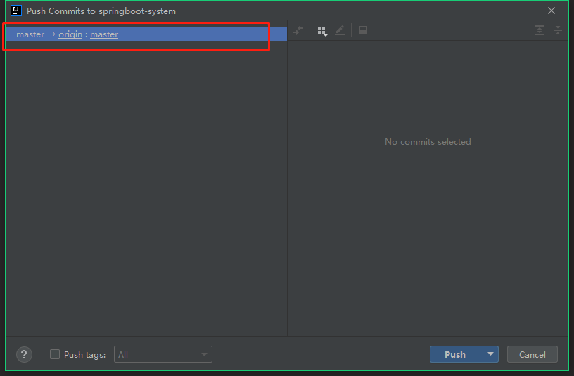选择点击这里,如果提示的是 master->Empty repository 就找到你的项目工程 右击使用Git Bash Here ,输入 git commit -m "Initial Commit" 然后IDEA中重新 push即可