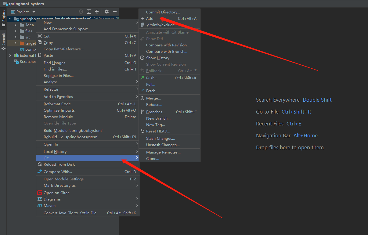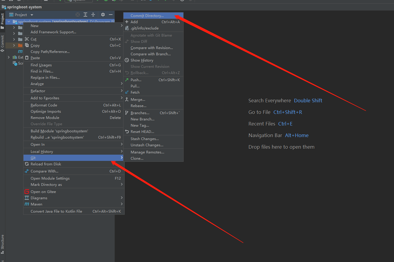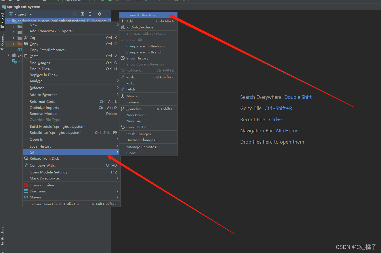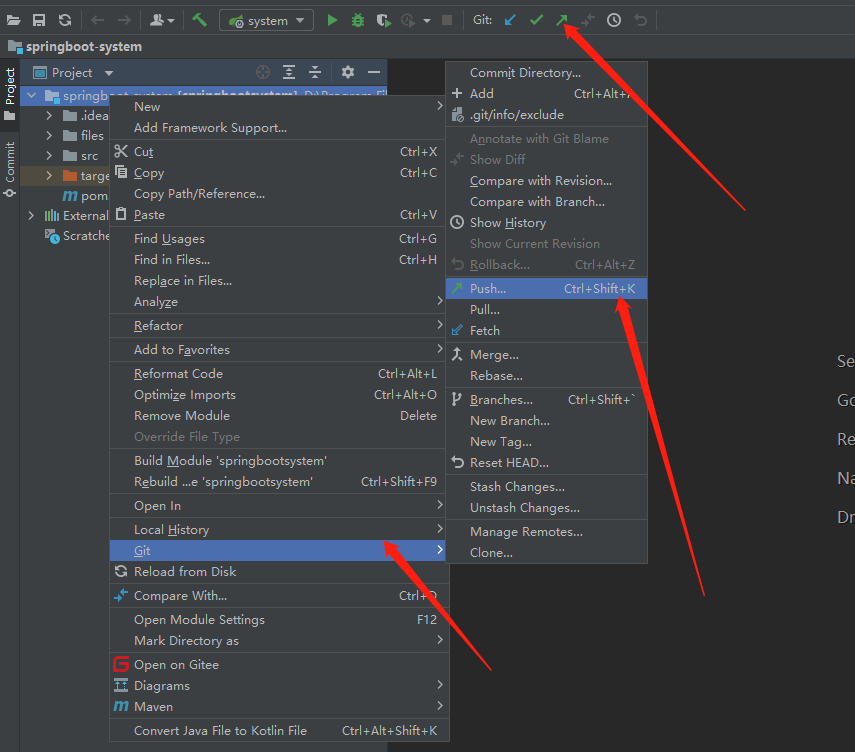 右击项目选择 Git——>push,或者选择工具栏的push箭头