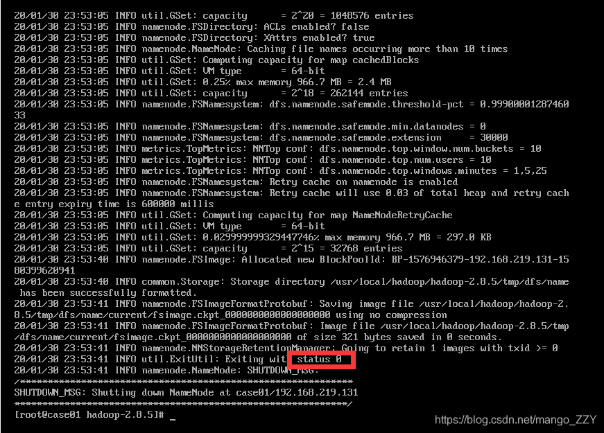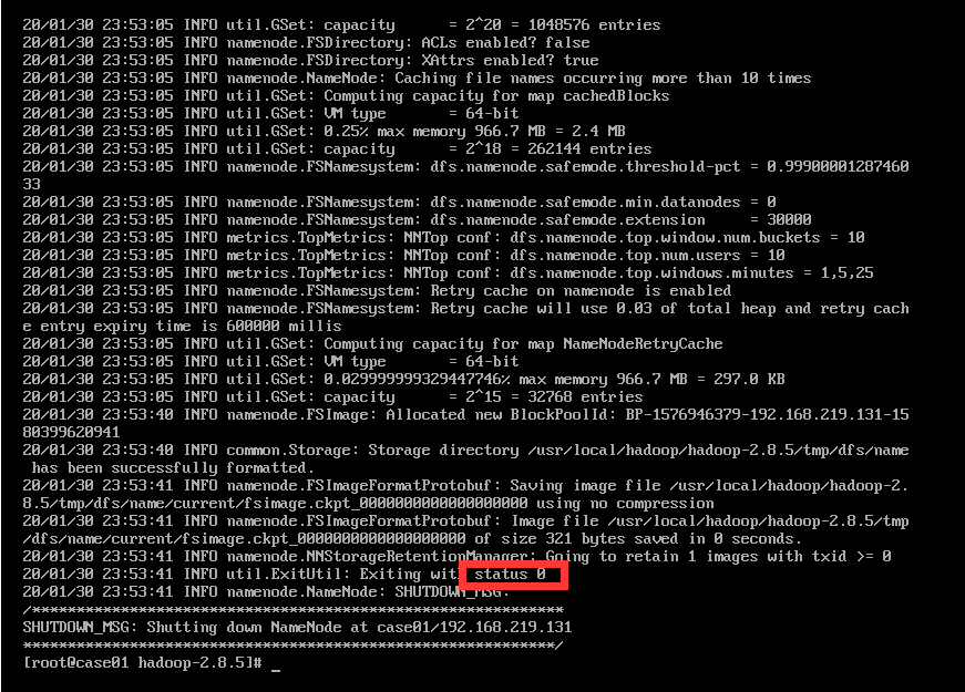 hdfs namenode –format看到status 0则代表格式化更改,如果是status 1则格式化失败,可以查看到报错。