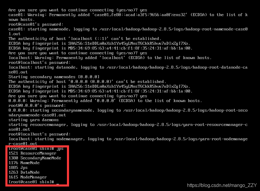 ./start-all.sh由于没有设置ssh免密登录,因此过程中会输入3次yes,4次密码(ssh免密登录下篇讲解)