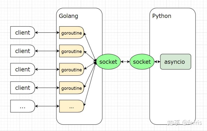 那么Wind使用的是哪个模型了? Wind使用是的混合模型,Wind是单进程单服务,网络库利用Golang的高并发特性,每个客户端连接启用一个线程来读取数据,同时为了减低业务逻辑编写难度,避免多线程锁问题,Python使用单线程异步协程来编写业务逻辑。网络层的多线程消息数据会通过一个队列来发给Python协程(asyncio)。