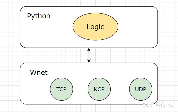 Wind的网络库由Golang编写,目前支持TCP,之后会支持KCP、Udp和Quic这些协议。每个客户端连接过来后,Golang会开一个线程去处理网络数据,有数据发过来后,Golang会将数据交给Python逻辑端处理,这里有个问题,就是Python线程和Golang线程是怎么进行交互的?Wind服务器引擎的主线程是在Python端,在起服务器时加载Golang编写的网络动态库(so文件或者DLL文件)并且开启网络线程处理客户端数据,目前Python与Golang的数据交互使用Socket通信交互,Python端启用一个TCP端口,Golang连接这个端口并且将数据传送给Python端。当然你也可以换Python与Golang的交互方式,比如换成ZMQ的zmq_inproc通信,使用zmq_inproc通信时,线程间共享一个ZMQ Context,可以通过共享内存来传递数据,不需要使用I/O线程,可以加快Python和Golang的交互。