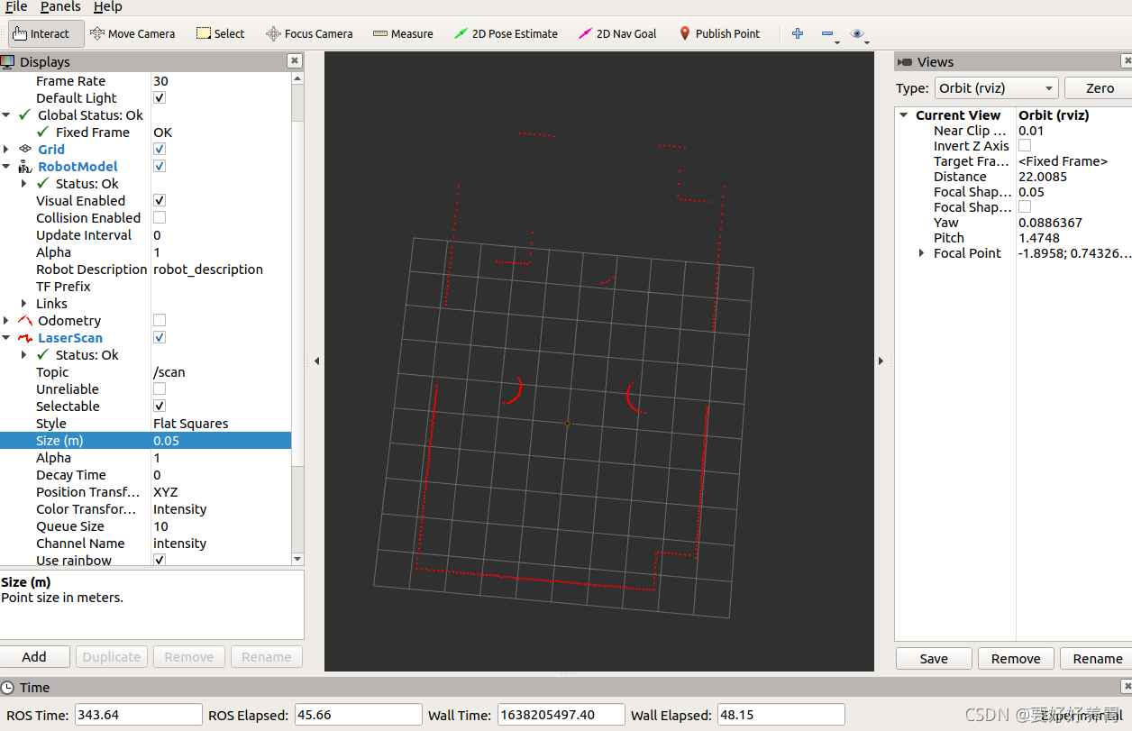 添加LaserScan组件,在topic选择/scan(非常重要!)。激光点的大小可以设置,可以大致看出来gazebo中的仿真环境的轮廓。