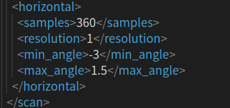 <min_angle>-3</min_angle> //采样范围,单位是弧度,以机器人朝向为中心