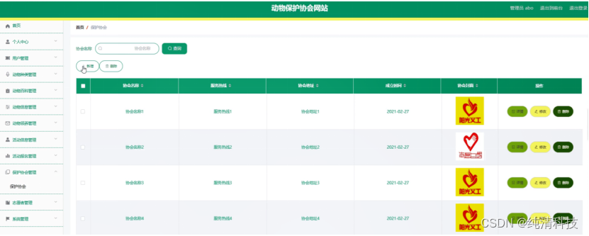 保护协会管理,在保护协会管理页面中可以对协会名称、服务热线、协会地址、成立时间、协会封面等信息进行详情、修改或删除等详细操作,如图5-14所示。