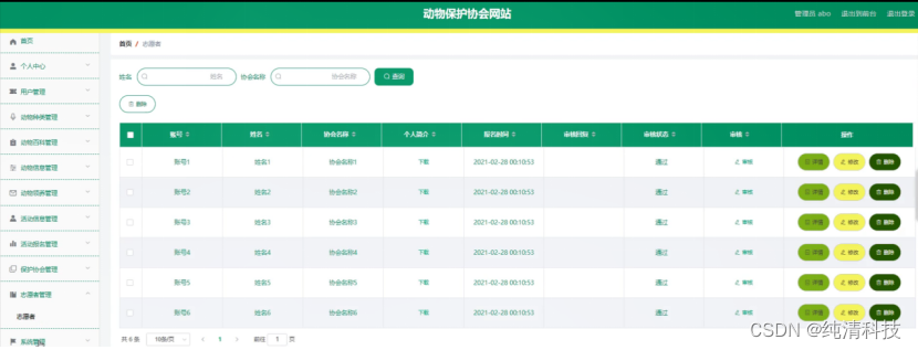志愿者管理,在志愿者管理页面中可以对账号、姓名、协会名称、个人简介、报名时间、审核回复、审核状态、审核等信息进行详情、修改或删除等详细操作,如图5-15所示。