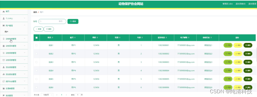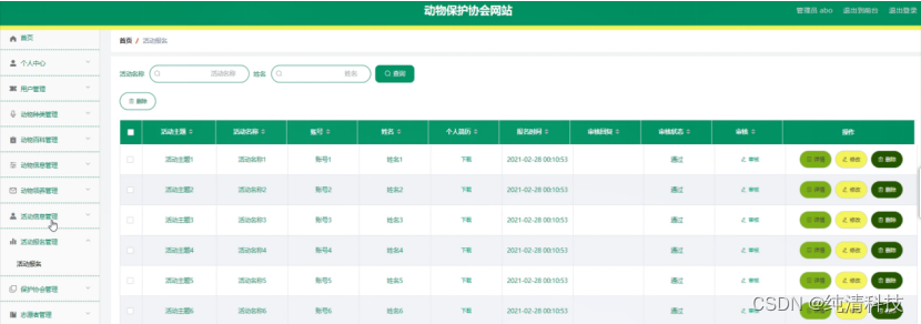 管理员登录进入网站可以查看首页、个人中心、用户管理、动物种类管理、动物百科管理、动物信息管理、动物领养管理、活动信息管理、活动报名管理、保护协会管理、志愿者管理、系统管理等信息进行相应操作,如图5-7所示。