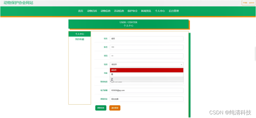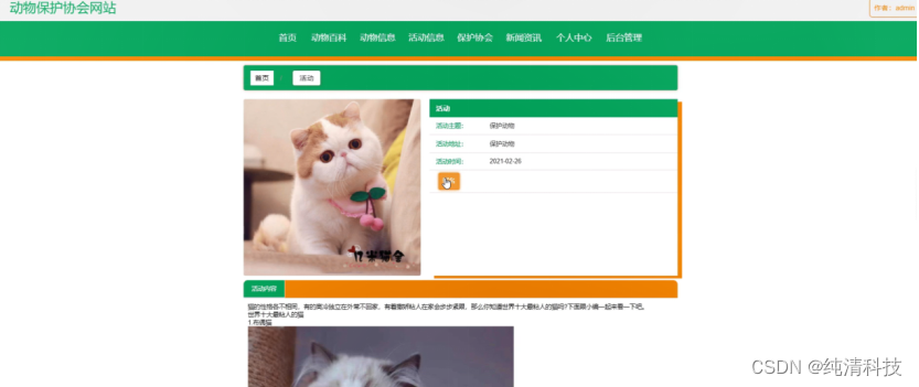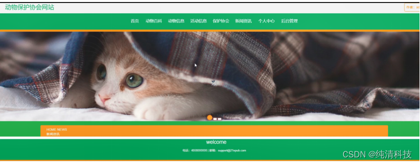 动物保护协会网站,在网站首页可以查看首页、动物百科、动物信息、活动信息、保护协会、新闻资讯、个人中心、后台管理等内容进行操作,如图5-1所示。
