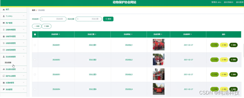 活动信息管理,在活动信息管理页面中可以对活动名称、活动主题、活动地址、活动封面、活动时间等信息进行详情、修改或删除等详细操作,如图5-12所示。