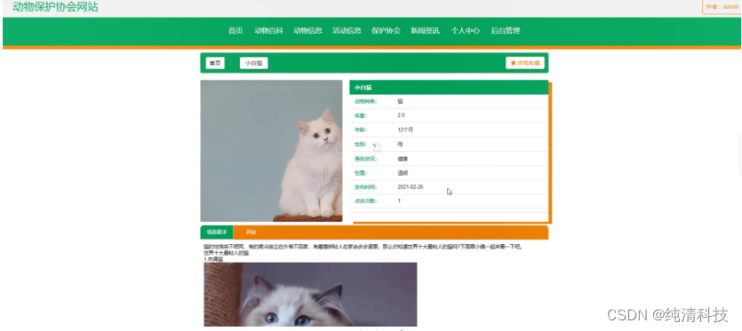 动物信息,在动物信息页面可以查看动物名称、动物种类、体重、年龄、性别、身体状况、性情、动物图片、发布时间、点击次数、领养要求等信息进行评论或收藏,如图5-2所示。