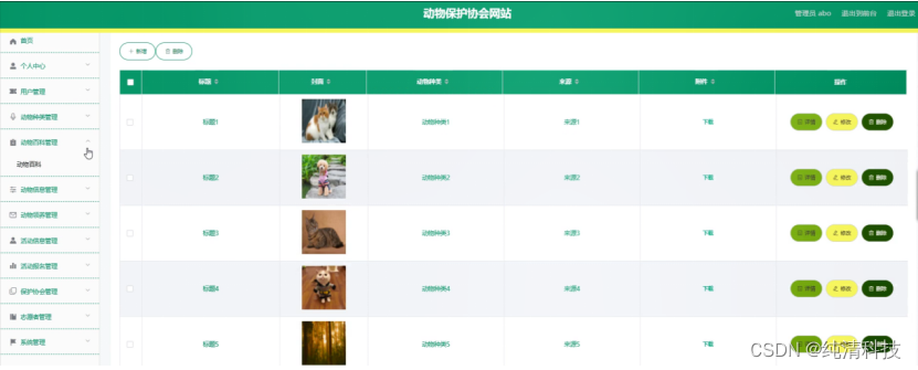 动物百科管理,在动物百科管理页面中可以对标题、封面、动物种类、来源、附件等信息进行详情,修改或删除等详细操作,如图5-9所示。