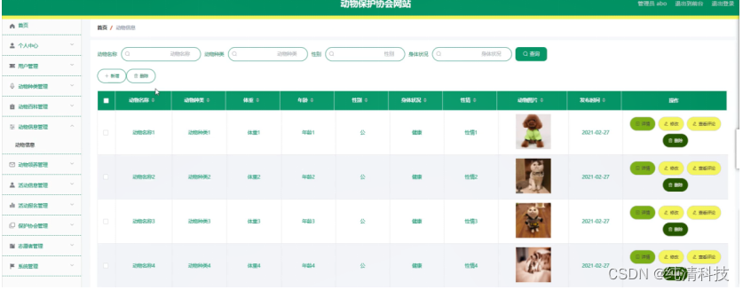 动物信息管理,在动物信息管理页面中可以对动物名称、动物种类、体重、年龄、性别、身体状况、性情、动物图片、发布时间等信息进行详情、修改、查看评论或删除等详细操作,如图5-10所示。