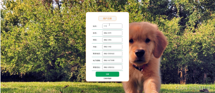 用户注册,在用户注册页面通过填写姓名、账号、密码、年龄、联系电话、电子邮箱、家庭住址等信息完成用户注册,如图5-4所示。在个人中心页面通过填写姓名、账号、密码、性别、年龄、联系电话、电子邮箱、家庭住址等信息进行个人信息更新操作,还可以根据需要我的收藏进行相应操作;如图5-5所示。