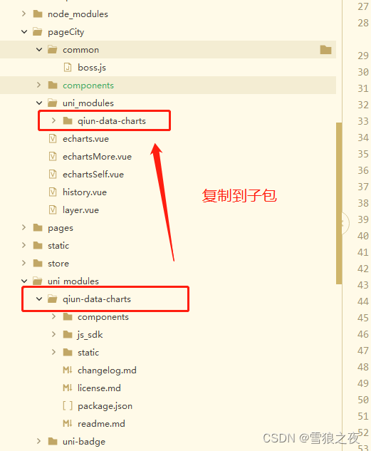来接下去你要只有子包才用的 common、components、uni_modules,就是这些js或者css直接移动到子包pageCity目录去。如步骤二那个图。