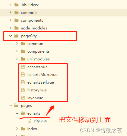 2、移动你原本的子页面文件(非pages.json里tabBar的页面!!)到pageCity目录(你别管我那些common、components、uni_modules)我后面会讲