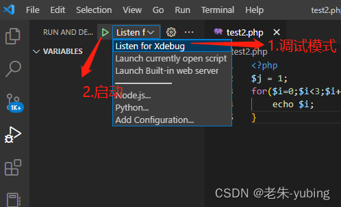 3、点击下拉菜单,选择php--》选择listen for xdebug