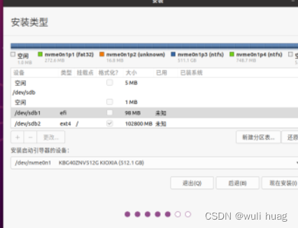 我们之前分的ESP区在这里分区类型就是efi,可以不用修改,紧接着的swap我们找到对应空间大小的磁盘,点击更改选着交换空间即可,再找到根目录对应的空间,挂载点(/),最后选着/home。最后最重要的引导文件安装选择efi对应的盘符,我这里就是sdb1。至于对分区到底是主分区还是逻辑分区这个问题,我建议将/设置为主分区,其他为逻辑分区,然后就是傻瓜式的next->next。