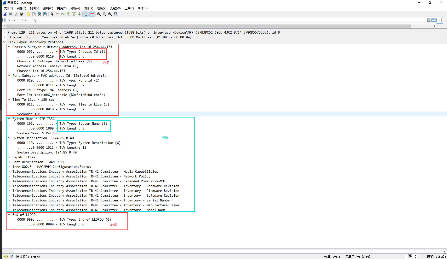 其中Chassis ID TLV,Port ID TLV Time To Live TLV以及End Of LLDPDU TLV是强制的,必须包含的部分,除此之外在TLV(Time To Live)和(End Of LLDPDU)TLV之间可以包含0个到多个可选的其它TLV(每个LLDPDU最多可携带28种TLV)。