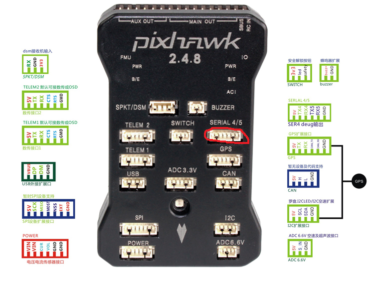 用了很多的pix系列开发板,新一代的pix4基本都不开源硬件了,调试接口搞了很久也没有调试通打印接口,还是用熟悉的pix2.4.8来调程序