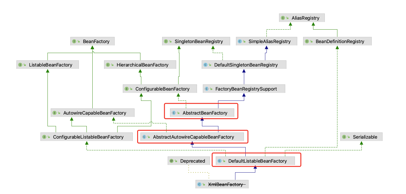 当我们想实现一个具体容器时,通过实现相应的接口来完成。比如DefaultListableBeanFactory是实现了ConfigurableBeanFactory,从而成为一个简单IOC容器。