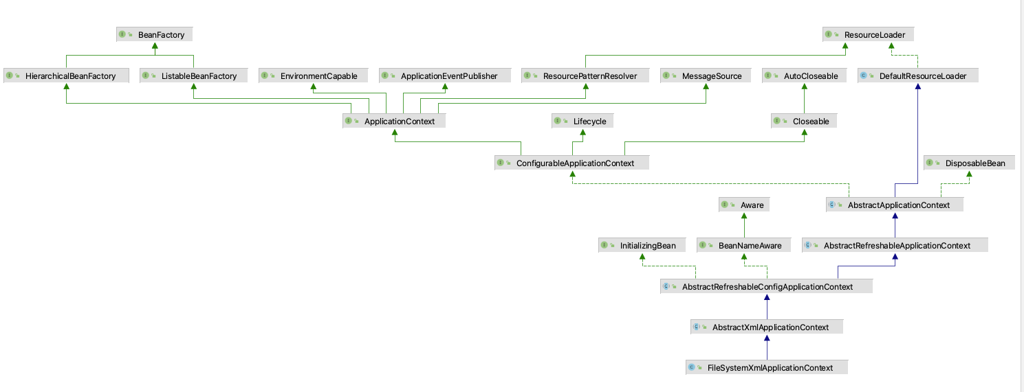 以FileSystemXmlApplicationContext为例,ApplicationContext的主要功能,已经在FileSystemXmlApplicationContext 的基类AbstractXmlApplicationContext中实现了。FileSystemXmlApplicationContext 只需要再实现自身设计的功能。