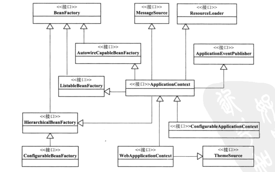 ApplicationContext设计主线:从BeanFactory到ListableBeanFactory再到ApplicationContet,再到我们常用的WebApplicationContext或者ConfigurableApplicationContext接口。继承ListableBeanFactory,细化了许多BeanFactory的接口功能。同时ApplicationContext通过继承MessageSource,ResourceLoader,ApplicationEventPublisher接口,在BeanFactory简单的IOC容器基础上添加了许多高级容器的特性的支持。
