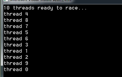 一开始我们创建10个线程,线程入口函数中使用条件变量等待ready为true,所以主函数中会先打印,接着在go函数中ready被置为ture,并调用notify_all唤醒所有线程