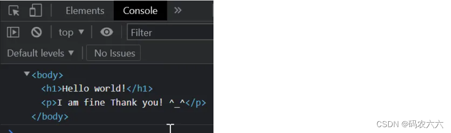 console.log(stringToHTML('<h1>Hello world!</h1><p>I am fine Thank you! ^_^</p>'));输出: