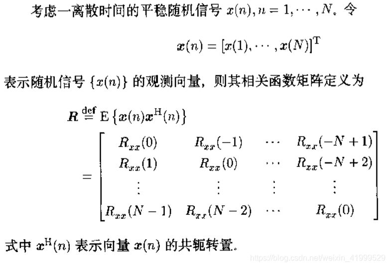 这种矩阵叫做Toeplitz矩阵,对角线元素相同,而且其他对角线也分别具有相同的元素。 由于Rxx(-K)= Rxx*(K),故一个N*N阶的Toeplitz矩阵由它的N个自相关函数Rxx(0),Rxx(1),...Rxx(N-1)所决定。