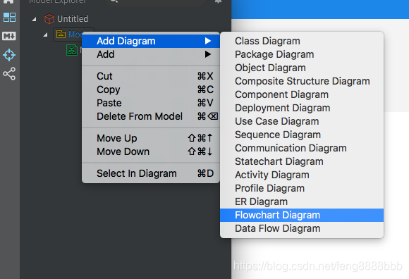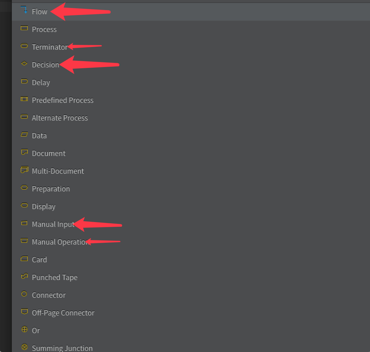 Flowchat Diagram就是流程图,然后就是画流程图要用到的操作符,选择流程图后,左下角就会出现画流程图需要的操作符。