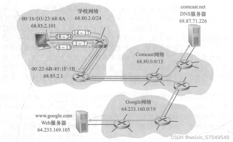 9,电脑将通过DNS协议获得www.google.com所对应的IP地址信息。之后,