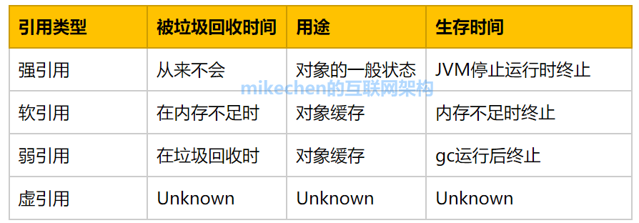 mikechen=null;显式地设置mikechen对象为null,或让其超出对象的生命周期范围,则GC认为该对象不存在引用,这时就可以回收这个对象,具体什么时候收集这要取决于GC算法。